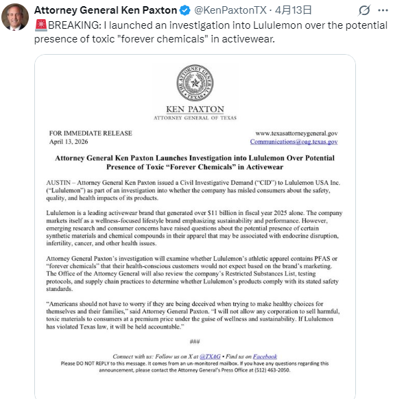 2026年4月,美国德克萨斯州总检察长Ken Paxton宣布对知名运动品牌Lululemon展开调查,指控其运动服饰中可能含有PFAS(全氟和多氟烷基物质)——俗称”永久化学品”。尽管Lululemon声称已于2024年初逐步淘汰PFAS,但此前Toxic-Free Future的检测发现,包括Lululemon在内的多个品牌瑜伽裤中氟含量超标,部分产品含有已被禁用的长链PFAS化合物。